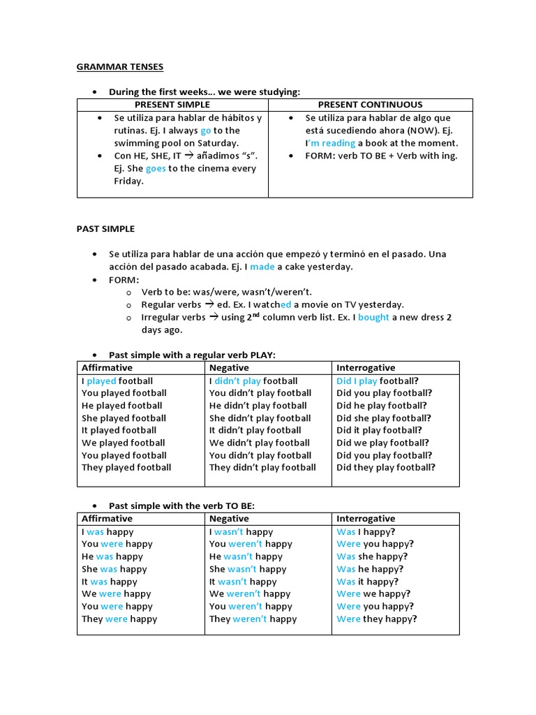 We use the second conditional to talk about hypothetical (imaginary) situations now, which are impossible (like in example 1 and 2) or about very unlikely situations in the future (like example 3). We didn't mean to hurt him. The contractor did not finish the work in one day. The words in green are signal words. 1) add a form of do (do or does) 2) add the word not (or use the contraction doesn't for does not or don't for do not) 3) use the verb in the base form (play, talk, write, etc.) to. Affirmative sentences in the simple present tense are changed into negatives by putting do not or does not before the verb. For negative sentences we use not after the auxiliaries am, is, are. 11.she's visiting her relatives right now. I was playing football the whole evening. This sentence could also have been written as she said she loves to play football.) the tense doesn't have to be changed in this case of reported speech. They do not play football. You do not play football. He is play ing football.